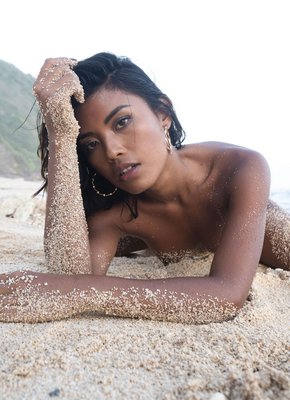 Описание: Чувственно извиваясь всем телом на горячем песке и постепенно снимая перед камерой короткое платье, эротическая темнокожая модель с миниатюрными титечками развратно позирует обнаженной на пляже и, совершенно ничего не скрывая от нас, бесстыже раскрывает свою бритую темную пизду.