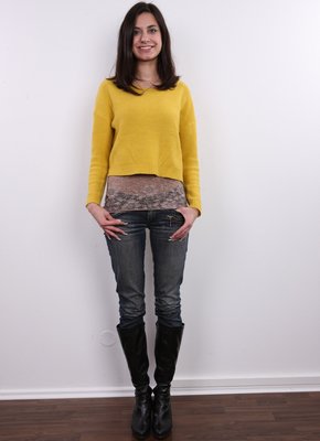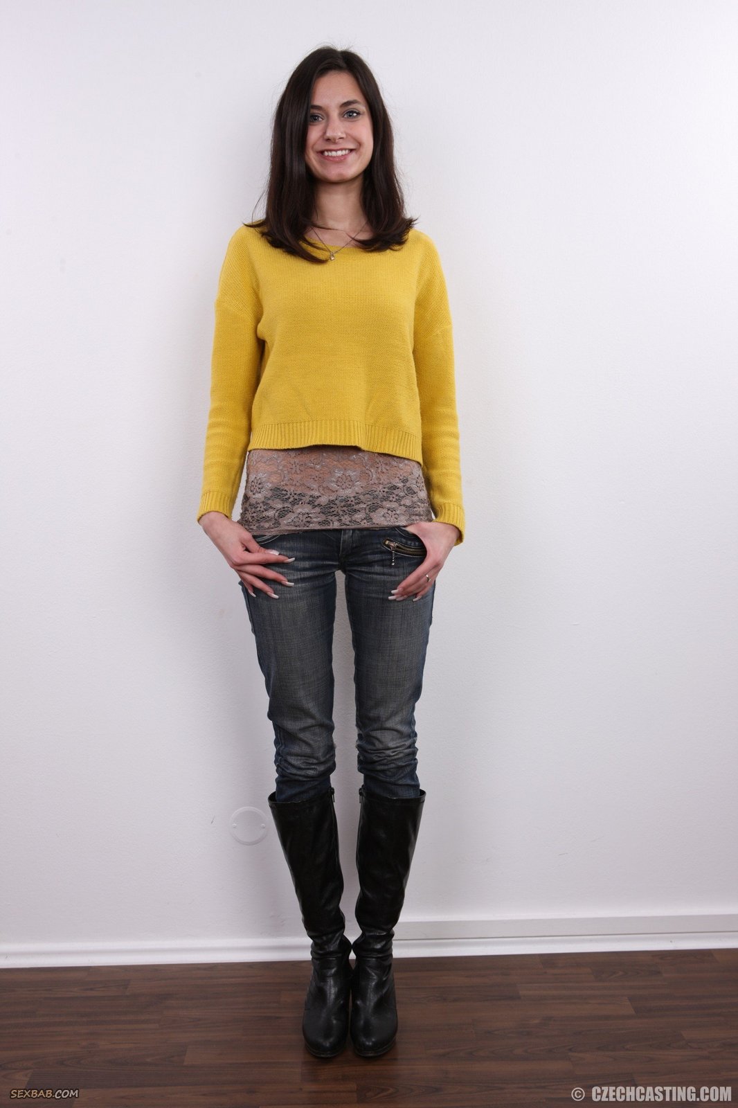 Описание: Встав на белом фоне в полный рост, обыкновенная простушка с широкой улыбкой разделась до гола перед камерой, по очереди снимая с себя всю одежду и нижнее белье. Не стесняясь своей наготы, худая брюнетка с упругими титьками с разных ракурсов показывает свою маленькую попу, а затем с широко раздвинутыми ногами крупным планом демонстрирует бритую сочную письку.