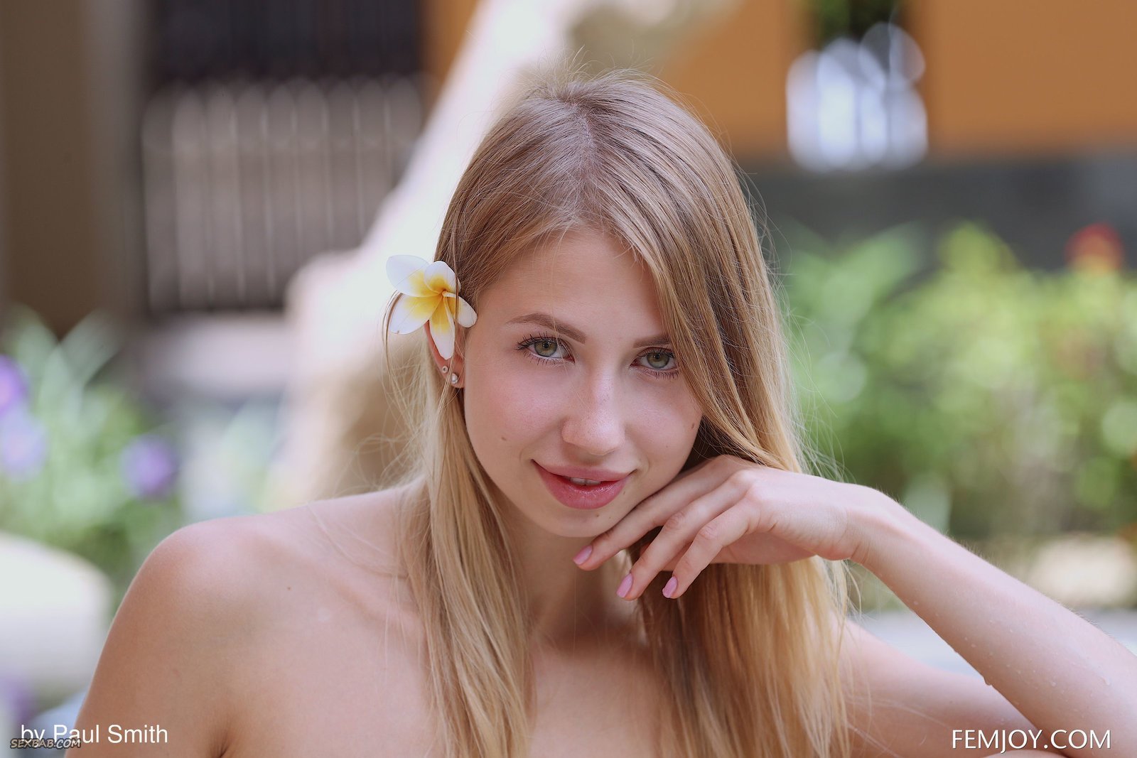 Описание: Выйдя из дома в одних трусах, нежная молодая блондинка решила немного развлечься у бассейна. Она нерешительно показывает и сжимает свои маленькие титьки с милыми сосками, а затем забирается в воду и открывает вид на все свое худое бледное тело с бритой безволосой писькой.