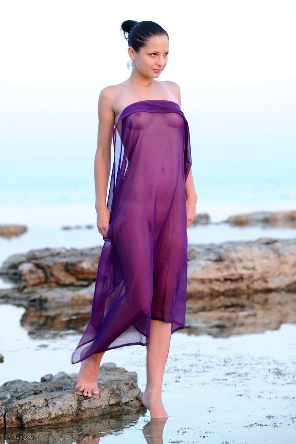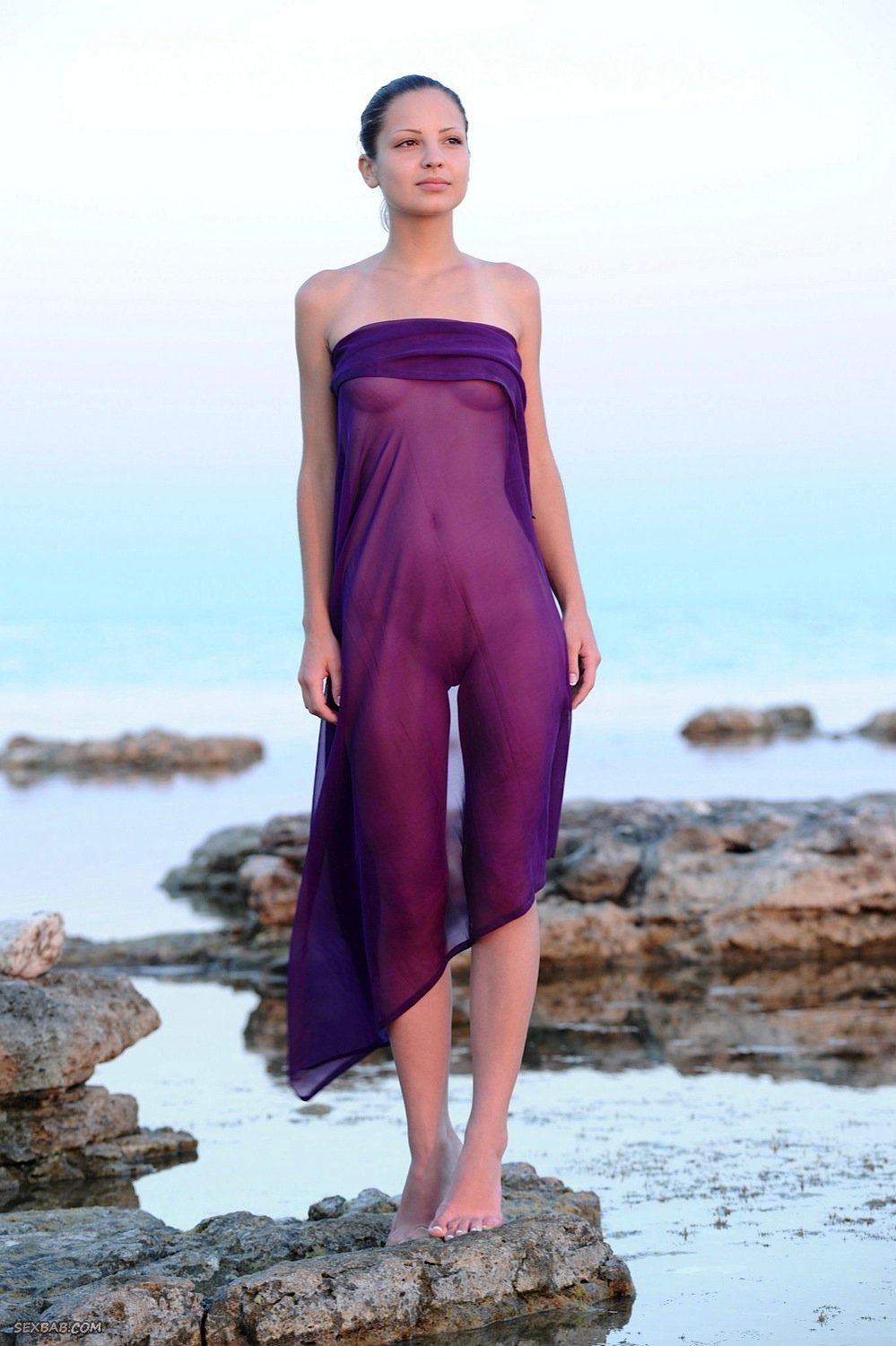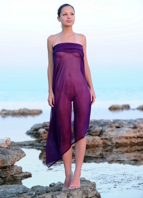 Описание: Скинув короткие шортики, обнажённая молодая девица резвится на море перед фотокамерой и с улыбкой на лице показывает себя со всех сторон, порой прикрываясь парео. Таким образом стройная брюнетка продемонстрировала красивые сиськи с бритой писькой, а намочившись повернулась мокрой попкой к фотографу.